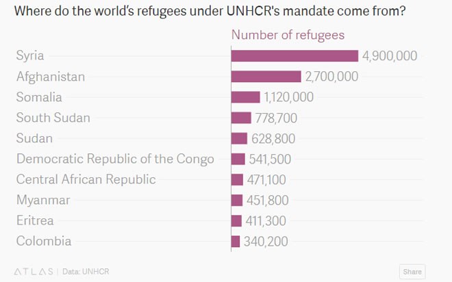 Of the 21.3 million refugees, 16.1 million were under UNHCR’s protection or “mandate,” and 5.2 million were Palestinian refugees protected by the separate United Nations Relief and Works Agency. Just three countries make up more than half of the world refugees overseen by UNHCR across the world: Syria (4.9 million refugees,) Afghanistan (2.7 million refugees) and Somalia (1.1 million refugees).