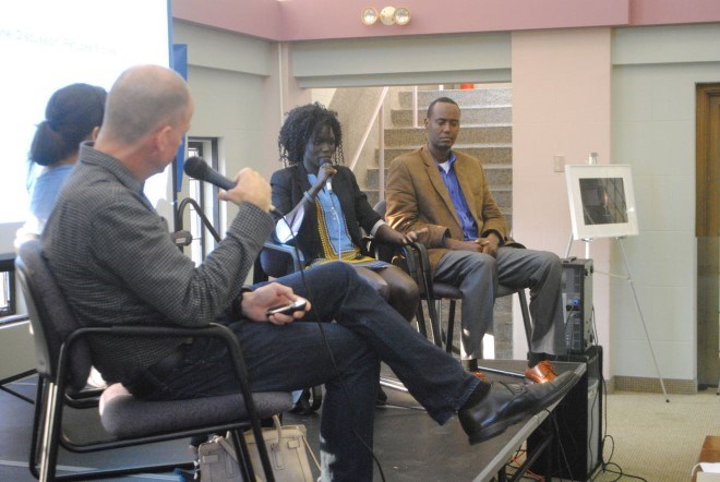 Abdullahi Ali, Jenny Srey and Nykuan Daniel shared stories of their harrowing struggles as refugees and family members of refugees Thursday night at a refugee panel at the Buckham Library.