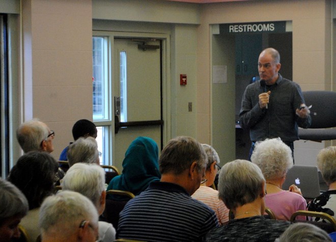 Photographer and journalist James Bowey addresses the crowd who attended Thursday night's refugee panel in Faribault. (Gunnar Olson/ Daily News)