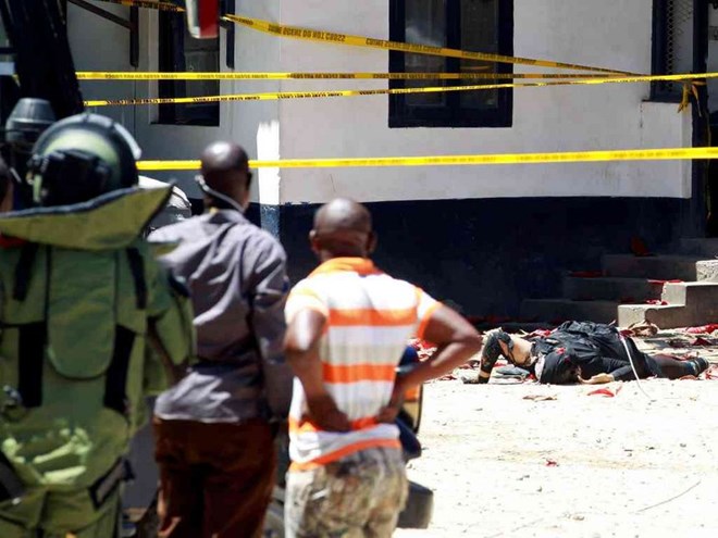 Police officers and explosive experts look at the body of a terror suspect outside the Central police station in Mombasa on September 11 /REUTERS