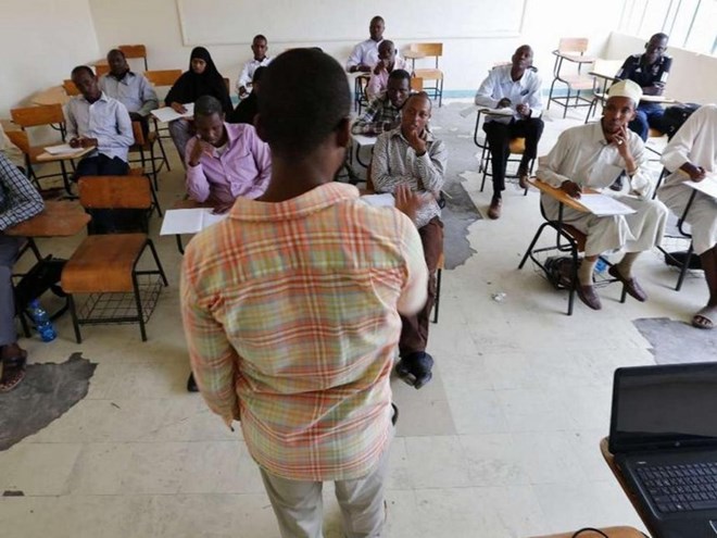 Said Omar, a lecturer at the Garissa University College, teaches third-year students as they return to the campus, January 11, 2016. /REUTERS