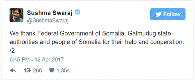 “I am happy to inform that 10 Indian nationals working as crew on MV AL Kausar which was hijacked by pirates have been rescued,” External Affairs Minister Sushma Swaraj tweeted.