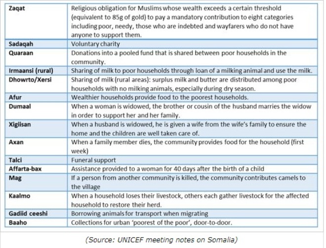 There is a heavy emphasis on helping the poor and vulnerable, albeit along clan lines. Table 1 gives a snapshot of prevalent traditional safety nets -- social programs that provide cash in exchange for children going to school or regular health check-ups -- that are integral to Somali’s society. Other development actors are also implementing various small-scale programs to provide social protection.