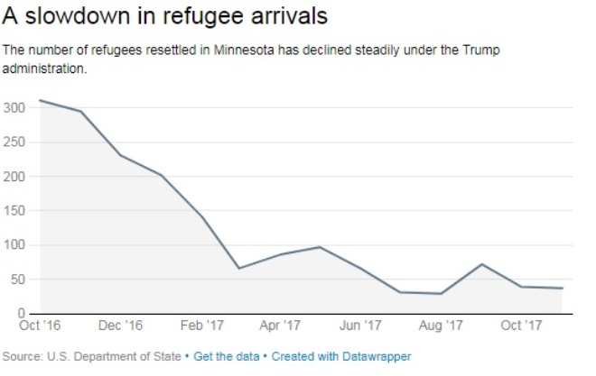 About 1,620 refugees came to Minnesota during the federal fiscal year, which ended Sept. 30, down more than 40 percent from the previous year. Comparing calendar year numbers is even starker: By the end of 2017, fewer than 950 refugees will have arrived in Minnesota, compared with more than 3,000 in 2016.