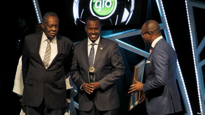 Somali Football Federation (SFF) President Abdiqani Said Arab receives the Leader of the Year award at the Confederation of African Football (CAF) awards in Abuja, Nigeria, Jan. 7, 2016. The SFF announced that Somalia will again host international matches.