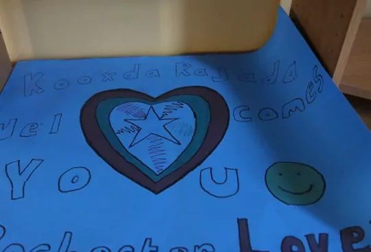 A welcome sign on blue poster board lays on a small desk just inside the front door. Scrawled across the bottom, in block letters, it reads: "Rochester Love!!!" In the living room, a 2-year-old girl sits mesmerized by an action movie on TV.