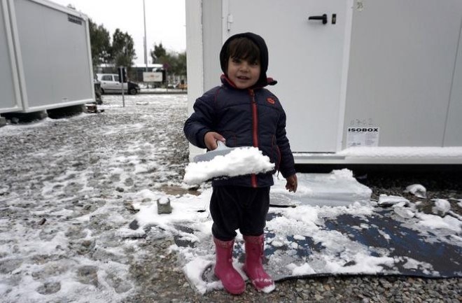 A child plays in the snow at the Kara Tepe camp on the island of Lesbos following heavy snowfalls on January 7, 2017. (AFP/Stringer)A child plays in the snow at the Kara Tepe camp on the island of Lesbos following heavy snowfalls on January 7, 2017. (AFP/Stringer)