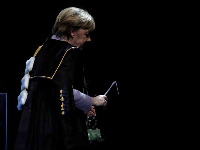 German Chancellor Angela Merkel leaves the stage after receiving a degree Honoris Causa, or honorary doctorate, from Belgian universities of KU Leuven and UGent, in Brussels, Belgium January 12, 2017. REUTERS/Yves Herman