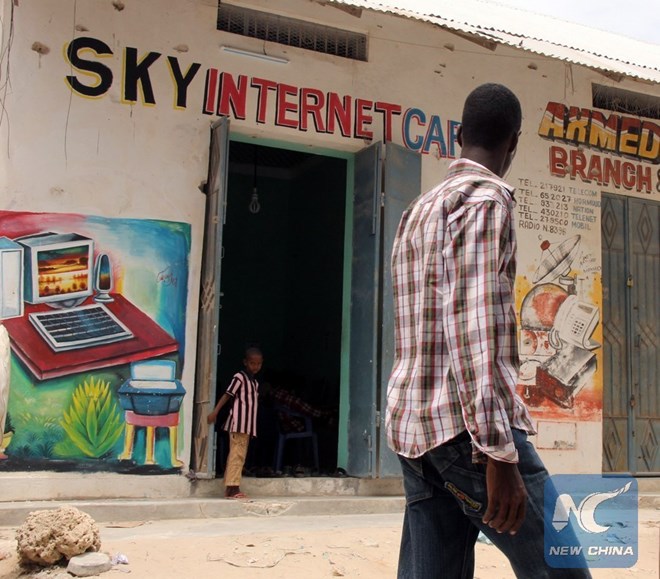 A man walks past one of the many Internet cyber cafes, which have sprung in Mogadishu, capital of Somalia, May 17, 2012. Internet use has become a popular new hobby among the youth in the capital, which has been enjoying relative peace since August last year following the withdrawal of Al Shabaab fighters. (Xinhua/Faisal Isse)