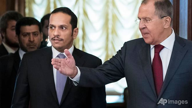 Russian Foreign Minister Sergey Lavrov (R) welcomes Qatari Foreign Minister Sheikh Mohammed bin Abdulrahman bin Jassim Al-Thani during their meeting in Moscow, Russia, on Jun 10, 2017. (Photo: AP/Pavel Golovkin)