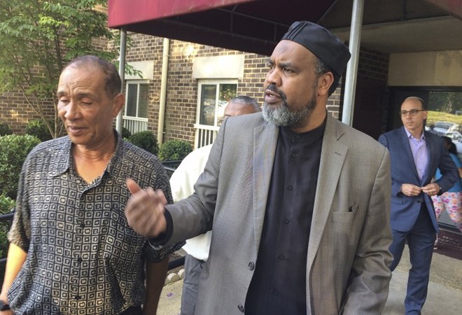 In this Tuesday, June 20, 2017 photo, Mohmoud Hassanen Aboras, left, whose daughter Nabra Hassanen was killed, listens as Imam Mohamed Magid, center, of the All Dulles Area Muslim Society, talks about the case in Reston, Va. (AP Photo/Matthew Barakat)