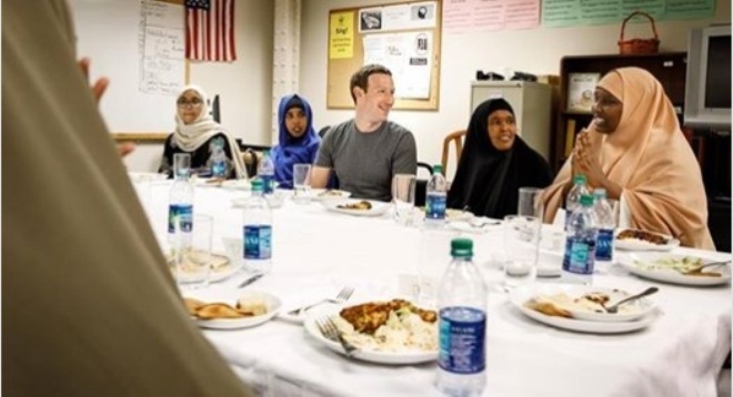 Flanked by Somali women in their hijabs in Minneapolis, Facebook founder and CEO Mark Zuckerberg marked the end of the holy month of Ramadan by eating his first Iftar dinner.