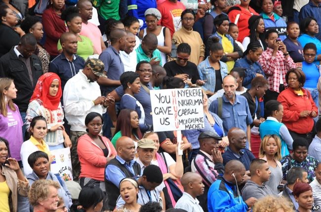 FILE - Demonstrators carry placards during a march against xenophobia in downtown Johannesburg, April 23, 2015.