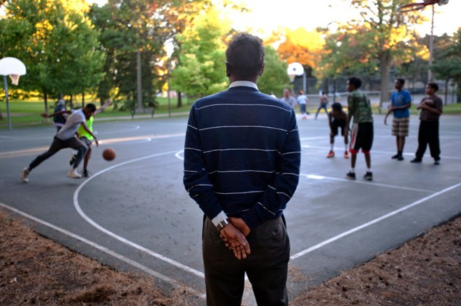 Somali-American boys play basketball in Currie Park in