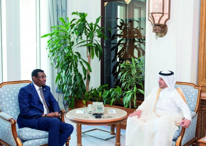 Prime Minister and Interior Minister H E Sheikh Abdullah bin Nasser bin Khalifa Al Thani with Minister of Internal Security of the Federal Republic of Somalia, Mohamed Abukar Islow, and the accompanying delegation on the occasion of their visit to the country.