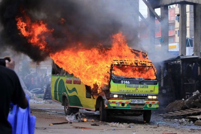 A minibus belonging to Forward Travellers sacco, a police lorry and two pull carts were torched outside Burma Market on Jogoo Road.