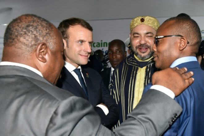 (LtoR) Gabon’s President Ali Bongo, French President Emmanuel Macron, King Mohammed VI of Morocco speak with Guinea-Bissau’s Prime Minister Umaro Sissoco Embalo as they attend the 5th African Union – European Union (AU-EU) summit in Abidjan, on November 29, 2017 © AFP / ISSOUF SANOGO