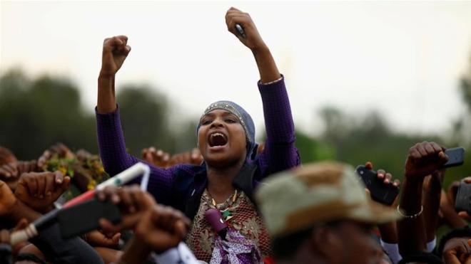 Demonstrators chant slogans while flashing the Oromo protest gesture during Irreecha in 2016 [Tiksa Negeri/Reuters]