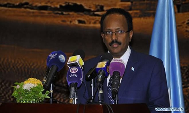 Somali President Mohamed Abdullahi Mohamed speaks during a joint press conference with his Sudanese counterpart Omar al-Bashir (not seen in picture) in Khartoum, capital of Sudan, on Oct. 5, 2017. Sudanese President Omar al-Bashir said on Thursday that his country would exert utmost efforts for peace and stability in Somalia. The President made the remarks at a joint press conference after a meeting with Mohamed Abdullahi Mohamed in the capital. (Xinhua/Mohamed Khidir)