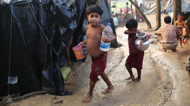 Rohingya children walk to their tents after fetching drinking water at a makeshift camp near Kutupalong refugee camp in Cox's Bazar, Bangladesh, Tuesday, Oct. 3, 2017. More than half a million Rohingya have fled from Myanmar to Bangladesh in just over a month, the largest refugee crisis to hit Asia in decades.