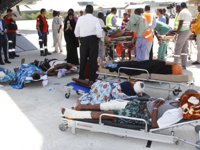 Critically wounded people wait to be moved into a waiting Turkish plane to be airlifted by air ambulance for treatment in Turkey, in Mogadishu, Somalia, Monday, Oct, 16