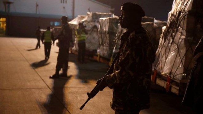 A Kenyan policeman guards a shipment of presidential election ballots arrived from Dubai ahead of Kenya's October 26th presidential election at the Jomo Kenyatta international airport in Nairobi, Kenya, on 21 October 2017. REUTERS/Baz Ratner