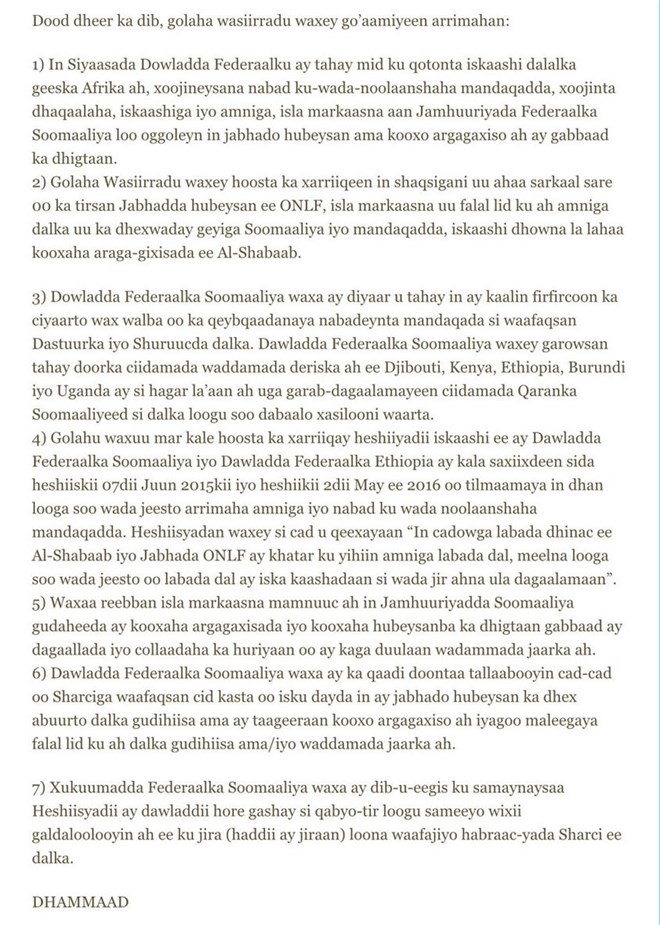 Pointing to a pair of agreements signed on June 7, 2015, and May 2, 2016, the Somali government said that it had entered into a security agreement with Ethiopia aimed at dismantling Al-Shabaab and ONLF operations in both countries. The documents also identified the two groups as “enemies” of Ethiopia and Somalia. The government said that the documents were signed by three former ministers - Mahad Mohamed Salad, Mohamed Jama Mursal Geelle, Abdikarim Guled before adding that they would be reviewing any agreements signed by the previous administration.
