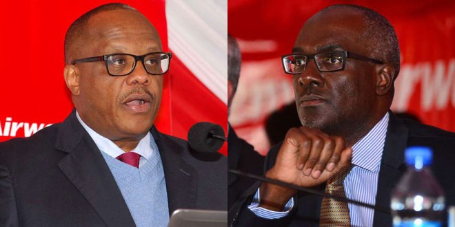 FORMER KENYA AIRWAYS FINANCE DIRECTOR ALEX MBUGUA (LEFT) AND EX-CEO MBUVI NGUNZE. PHOTOS | FILE | NMG
