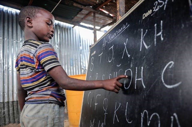 A displaced Somali boy attends a class to learn alphabets and numbers at a makeshift school at the Badbado IDP camp in Mogadishu, Somalia, on June 25, 2018.MOHAMED ABDIWAHAB/AFP/Getty Images