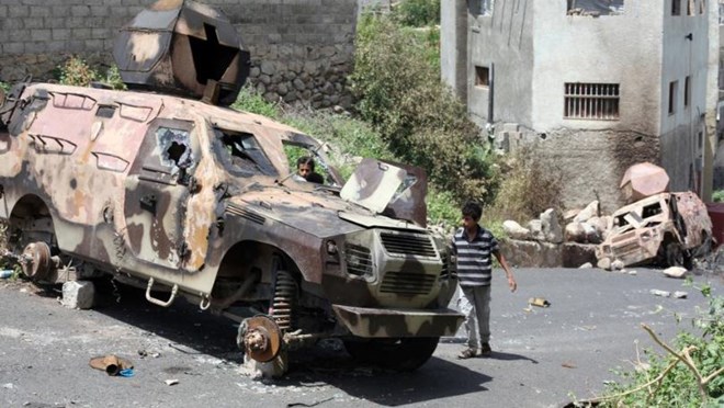 A boy walks past an armoured personnel carrier, damaged during recent clashes between pro-government forces and armed militants in Taiz, Yemen August 14, 2018 (Reuters Archive)