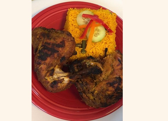 A half chicken from Maty’s African Restaurant in Detroit, served with yellow rice.