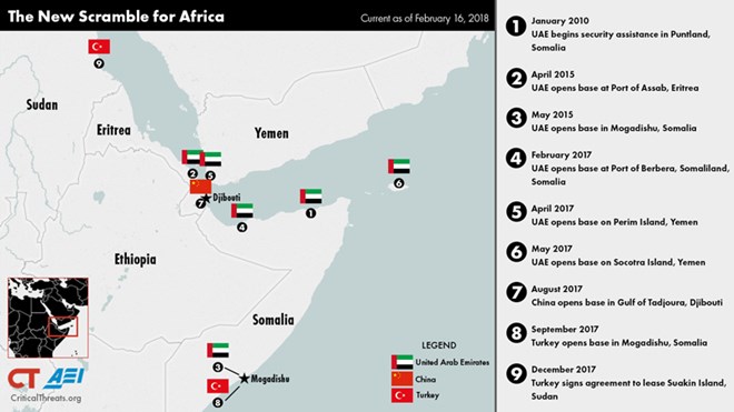 . A sharp uptick in the expansion of foreign militaries in the Horn of Africa accompanied the growth of economic competition in the region in 2017. China, Turkey, and the United Arab Emirates have opened military bases throughout the area in the past two years. The region is strategically important to these states for various reasons: securing shipping routes in the , proximity to the ongoing conflict in Yemen, and the desire to array forces in the region alongside rivals including the United States.