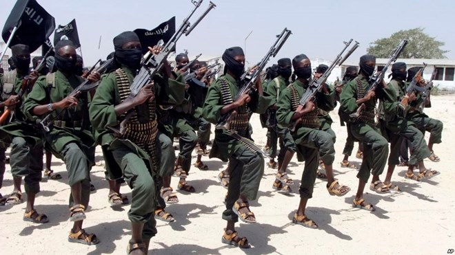 FILE - Hundreds of newly trained al-Shabab fighters perform military exercises in the Lafofe area 18 km south of Mogadishu, Somalia, Feb. 17, 2017.