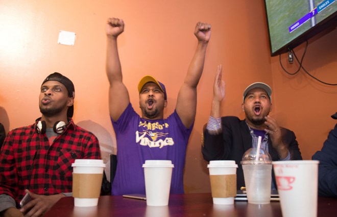 A group of young, avid football fans watch highlights of the Minnesota Vikings' postseason victory over the New Orleans Saints, at a popular Somali market, before the NFL's Super Bowl in Minneapolis, Minnesota, U.S. January 19, 2018. Picture taken January 19, 2018. REUTERS/Craig Lassig