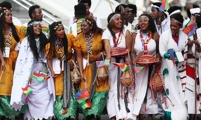 Dancers welcome Eritrea’s leader, Isaias Afwerki, to Addis Ababa. Photograph: Tiksa Negeri/Reuters