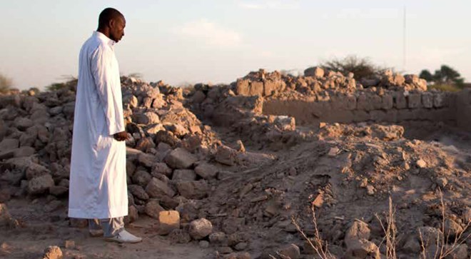 A man prays at a site destroyed by violent extremists in early 2012,Timbuktu, Mali. UN Photo/marco Dormino