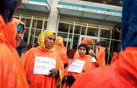The argument was scheduled in one of the Eighth Circuit courtrooms in the Minneapolis federal courthouse where the case was tried. During trial, Somali and other supporters of the defendants held protests against the charges outside the courthouse and packed the courtroom. On appeal, Somali supporters of the defendants resumed their position outside (at right).