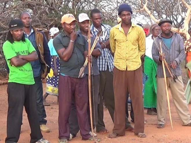 Sosoma residents with bows and arrows. They are forced to stay armed as well since the Somali herders are armed as well./LYDIA NGOLO