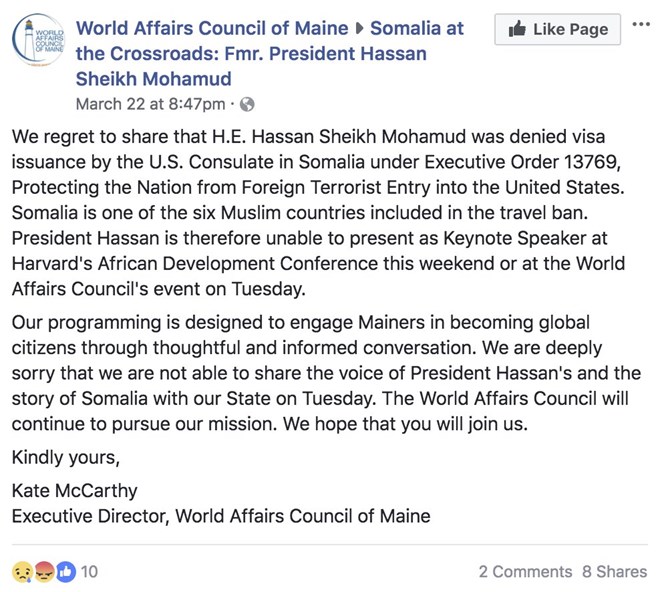 "World Affairs Council of Maine regrets to share that H.E. Hassan Sheikh Mohamud was denied visa issuance by the U.S. Consulate in Somalia under Executive Order 13769, Protecting the Nation from Foreign Terrorist Entry into the United States. Somalia is one of the six Muslim countries included in the travel ban. President Hassan is therefore unable to present as Keynote Speaker at Harvard’s African Development Conference this weekend or at the World Affairs Council’s event on Tuesday."Although the World Affairs Council of Maine said Mohamud was banned under Executive Order 13769, that Executive Order was revoked and replaced by Executive Order 13780 and further expanded by Presidential Proclamation 9645 which explicitly restricts travel from eight nations, six of them predominantly Muslim: Iran, Libya, Syria, Yemen, Somalia, Chad, North Korea and Venezuela.