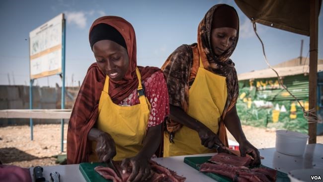 On the outskirts of Bosaso, women have been trained to process fish meat into a dried fish product to be sold in inland Somalia.