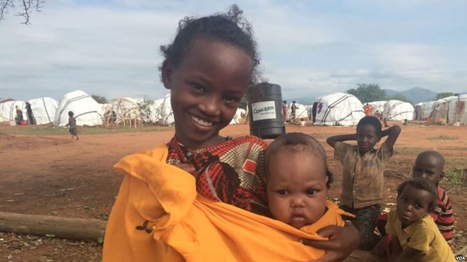 Machi, an Ethiopian refugee in Kenya's Dambala Fachana camp, carries her youngest sister, Lelo. They came to the camp with their family in March. (D. Gelmo/VOA)