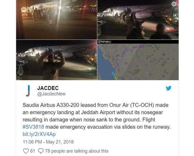 The aircraft circled over Jeddah for several hours as its landing gear failed to drop, forcing the captain to make the emergency landing, Saudi media reported.