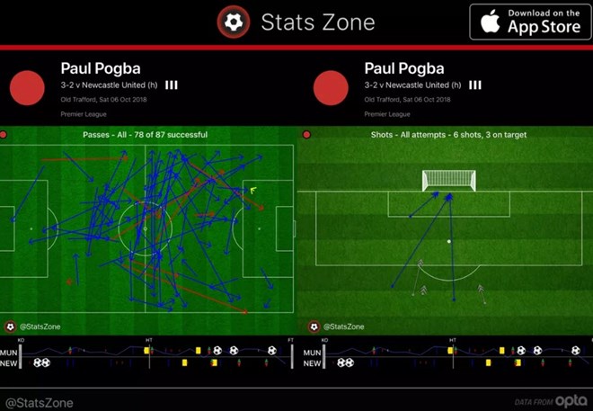 The best player in the second half was Paul Pogba. Once United switched to an all-out attacking tactic with very little structure, Pogba started driving the team forward. He led all players in touches, completed passes, and shots. Most of his passing was positive, and he had an assist.