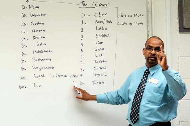 Garaad Muse teaches numbers of the Somali language during a class at South Central College. SCC is the first state college in the state university system to offer a Somali course. Photo by Jackson Forderer