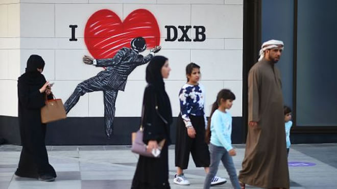 Pedestrians walk past street art in Dubai, United Arab Emirates.