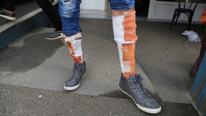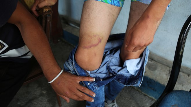 A refugee shows his bloodied legs after an alleged police beating [Mersiha Gadzo/Al Jazeera]