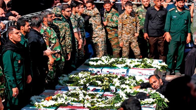 Members of Iranian military mourn during a public funeral for those killed during Saturday's attack in Ahvaz.