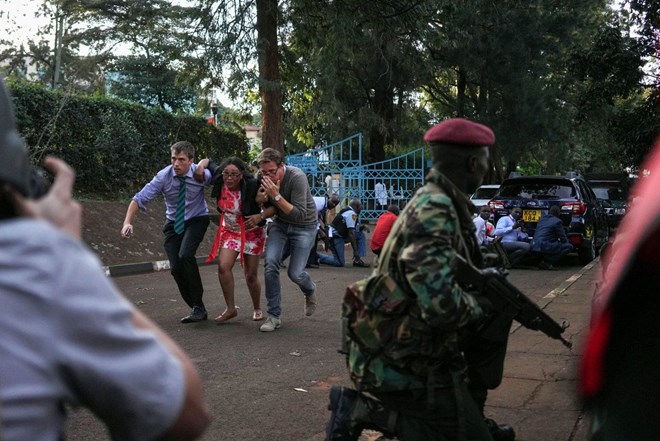 People take cover during the attack in Nairobi on Jan. 15, 2019. (Bloomberg)