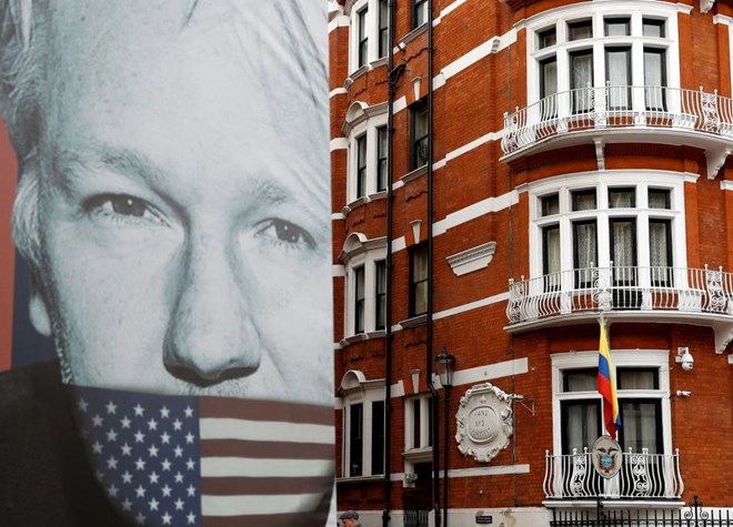 An image of Julian Assange next to the Ecuador embassy in London. Peter Nicholls REUTERS