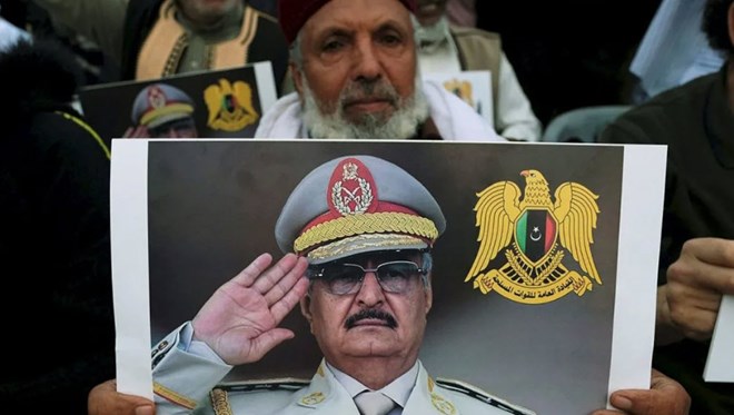 A Libyan man carries a picture of Khalifa Haftar during a demonstration to support Libyan National Army offensive against Tripoli, in Benghazi, Libya April 12, 2019 Credit REUTERS/Esam Omran Al-Fetori
